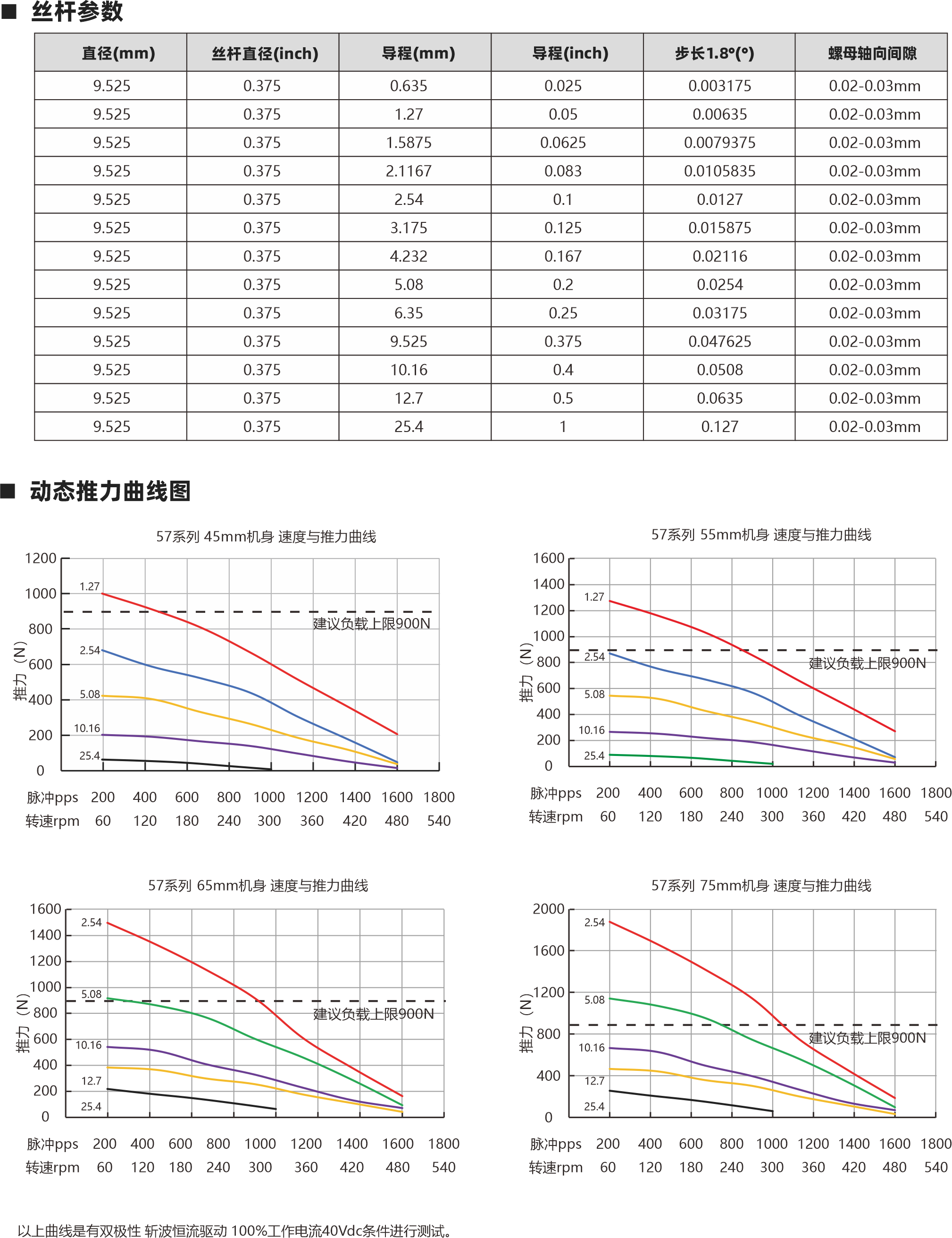 57系列絲桿電機(jī) 57系列絲桿電機(jī) 動(dòng)態(tài)推力曲線圖 外形圖  相數(shù) 步距角精度 IP等級(jí)  認(rèn)證 絕緣等級(jí) 運(yùn)行環(huán)境溫度 2 ±5% 40 RoHS CE ISO9001 B(130℃) -20℃~ +50℃ 螺母類型 電機(jī)參數(shù) 57 45mm 0.7 3A 0.75Ω 0.72mH 2.25V 3A 0.92Ω 4.5mH 2.76V 4A 0.78Ω 3.3mH 3.12V 電機(jī)類型 機(jī)身L(mm) 保持力矩(N.m) 額定電流(A) 電阻(Ω) 額定電感(mH) 額定電壓(V) 絲桿參數(shù) 0.375 0.635 0.025 0.003175 9.525 0.02-0.03mm 0.375 1.27 0.05 0.00635 9.525 0.02-0.03mm 0.375 1.5875 0.0625 0.0079375 9.525 0.02-0.03mm 0.375 2.1167 0.083 0.0105835 9.525 0.02-0.03mm 0.375 2.54 0.1 0.0127 9.525 0.02-0.03mm 0.375 3.175 0.125 0.015875 9.525 0.02-0.03mm 0.375 4.232 0.167 0.02116 9.525 0.02-0.03mm 0.375 5.08 0.2 0.0254 9.525 0.02-0.03mm 0.375 6.35 0.25 0.03175 9.525 0.02-0.03mm 0.375 9.525 0.375 0.047625 9.525 0.02-0.03mm 0.375 10.16 0.4 0.0508 9.525 0.02-0.03mm 0.375 12.7 0.5 0.0635 9.525 0.02-0.03mm 0.375 25.4 1 0.127 9.525 0.02-0.03mm 絲桿直徑(inch) 直徑(mm) 導(dǎo)程(mm) 導(dǎo)程(inch) 步長1.8°(°) 螺母軸向間隙 55mm 0.9 65mm 1.5 75mm 1.8 4A 0.95Ω 4.5mH 3.8V 4A 0.97Ω 7mH 3.88V 5A 0.7Ω 3.2mH 3.5V 2.2 84mm(貫穿除外) 100mm(貫穿除外) 2.5 25.4 5 3-Φ3.5 三角形螺母 外部驅(qū)動(dòng)式電機(jī) 貫通軸式電機(jī) 57系列 45mm機(jī)身 速度與推力曲線 57系列 55mm機(jī)身 速度與推力曲線 脈沖pps 轉(zhuǎn)速rpm 200 60 400 120 600 180 800 240 1000 300 1200 360 1400 420 1600 480 1800 540 脈沖pps 轉(zhuǎn)速rpm 200 60 400 120 600 180 800 240 1000 300 1200 360 1400 420 1600 480 1800 540 1200 1000 800 600 400 200 0 1600 1400 1200 1000 800 600 400 200 0 1.27 2.54 5.08 10.16 25.4 1.27 2.54 5.08 10.16 25.4 1.5 Lx L 高柔電纜線 5 56.2 47.14 M6X1 Lx L 高柔電纜線 1.5 12 5 7 3- 5.1 28.6 40 圓形螺母 消隙螺母 57系列 75mm機(jī)身 速度與推力曲線 脈沖pps 轉(zhuǎn)速rpm 200 60 400 120 600 180 800 240 1000 300 1200 360 1400 420 1600 480 1800 540 2000 1600 1200 800 400 0 2.54 5.08 10.16 12.7 25.4 57系列 65mm機(jī)身 速度與推力曲線 脈沖pps 轉(zhuǎn)速rpm 200 60 400 120 600 180 800 240 1000 300 1200 360 1400 420 1600 480 1800 540 1600 1400 1200 1000 800 600 400 200 0 2.54 5.08 10.16 12.7 25.4 建議負(fù)載上限900N 建議負(fù)載上限900N 建議負(fù)載上限900N 建議負(fù)載上限900N 步進(jìn)直線傳動(dòng)產(chǎn)品制造商 Linear stepper motor provider 步進(jìn)直線傳動(dòng)產(chǎn)品制造商 Linear stepper motor provider 以上曲線是有雙極性 斬波恒流驅(qū)動(dòng) 100%工作電流40Vdc條件進(jìn)行測(cè)試。