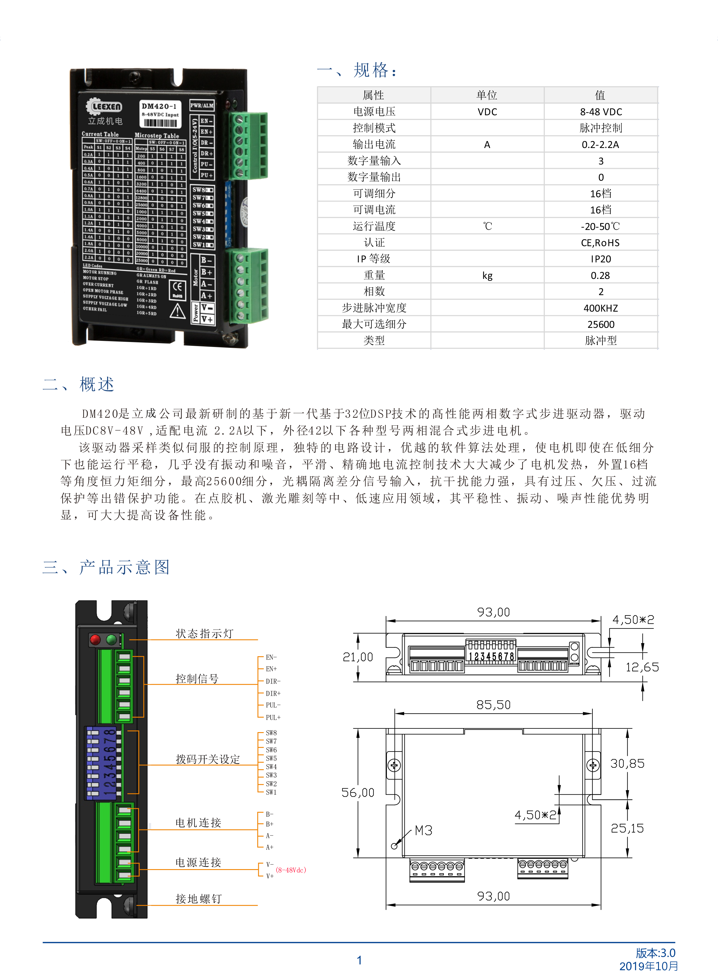 DM420是立成公司最新研制的基于新一代基于32位DSP技術的高性能兩相數(shù)字式步進驅動器,驅動電壓DC8V-48V適配電流 2.2A以下,外徑42以下各種型號兩相混合式步進電機。該驅動器采樣類似伺服的控制原理,獨特的電路設計,優(yōu)越的軟件算法處理,使電機即使在低細分下也能運行平穩(wěn),幾乎沒有振動和噪音,平滑、精確地電流控制技術大大減少了電機發(fā)熱,外置16檔等角度恒力矩細分,最高25600細分,光耦隔離差分信號輸入,抗干擾能力強,具有過壓、欠壓、過流保護等出錯保護功能。在點膠機、激光雕刻等中、低速應用領域,其平穩(wěn)性、振動、噪聲性能優(yōu)勢明顯,可大大提高設備性能。