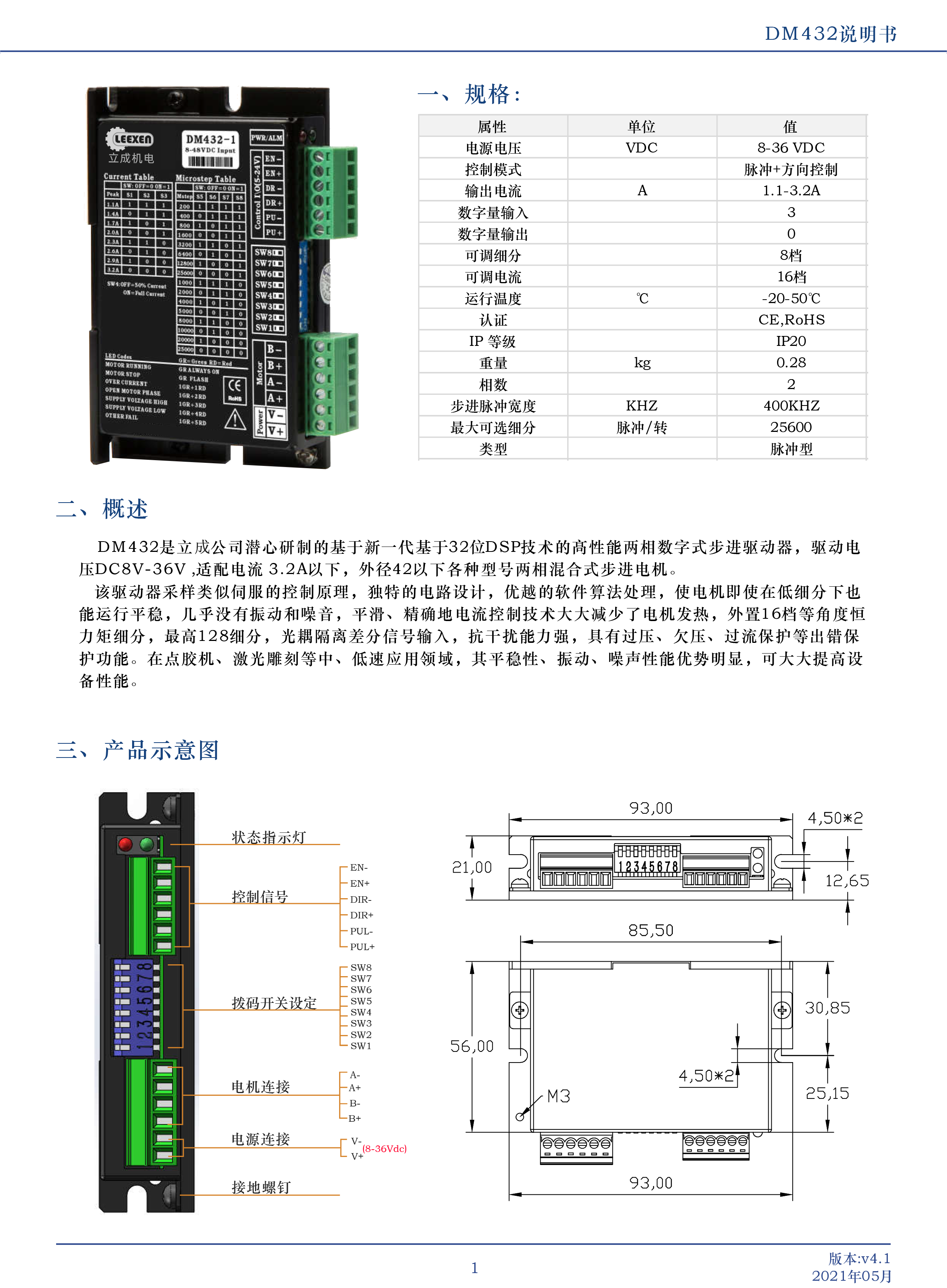 DM432是立成公司潛心研制的基于新一代基于32位DSP技術(shù)的高性能兩相數(shù)字式步進(jìn)驅(qū)動(dòng)器,驅(qū)動(dòng)電壓DC8V-36V適配電流 32A以下,外徑42以下各種號(hào)兩相混合式步進(jìn)電機(jī)該驅(qū)動(dòng)器采樣類似伺服的控制原理,獨(dú)特的電路設(shè)計(jì),優(yōu)越的軟件算法處理,使電機(jī)即使在低細(xì)分下也能運(yùn)行平穩(wěn),幾乎沒有振動(dòng)和噪音,平滑、精確地電流控制技術(shù)大大減少了電機(jī)發(fā)熱,外置16檔等角度恒力矩細(xì)分,最高128細(xì)分,光耦隔離差分信號(hào)輸入,抗干擾能力強(qiáng),具有過壓、欠壓、過流保護(hù)等出錯(cuò)保護(hù)功能。在點(diǎn)膠機(jī)、激光雕刻等中、低速應(yīng)用領(lǐng)域,其平穩(wěn)性、振動(dòng)、噪聲性能優(yōu)勢明顯,可大大提高設(shè)備性能。